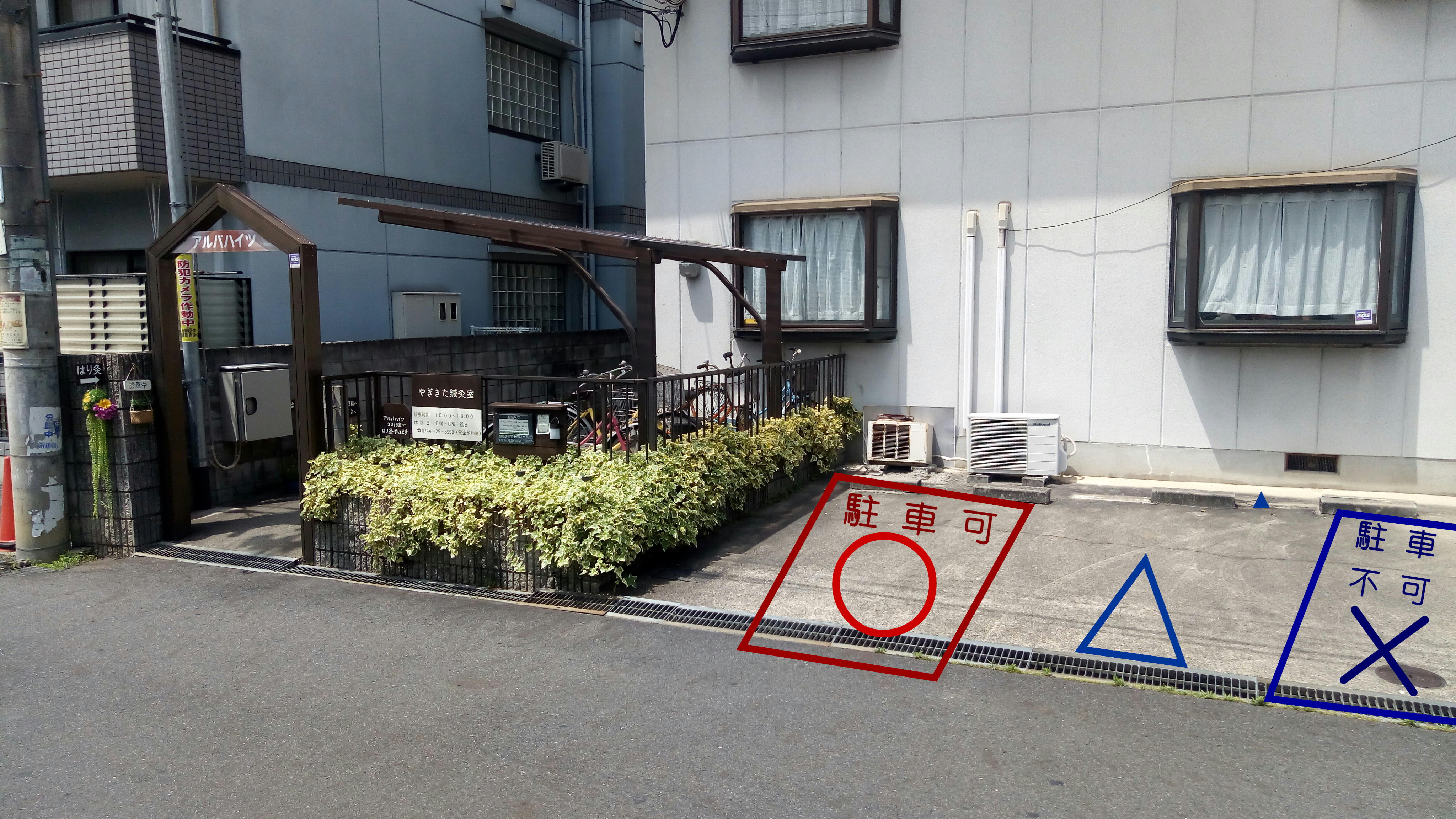 また、下の写真の赤線で四角く囲ってあるところ(建物に向かって左側)も駐車可能です。ここはアルパハイツ共用の駐車場ですので、空いている場合のみ駐車できます(△も空いていれば可)。右側のスペースは空いていてもご利用になれません。ご了承ください。