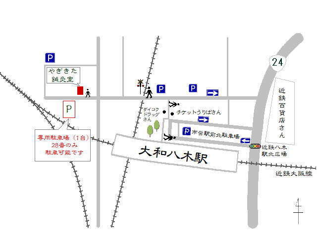 国道24号線「近鉄八木駅北広場」信号を左折、ドラッグストアさんとチケットうりばさんの間の細い道を直進、突き当り左折、踏切を越えて直進、交差点を越えれば右手に当院の看板がみえます。