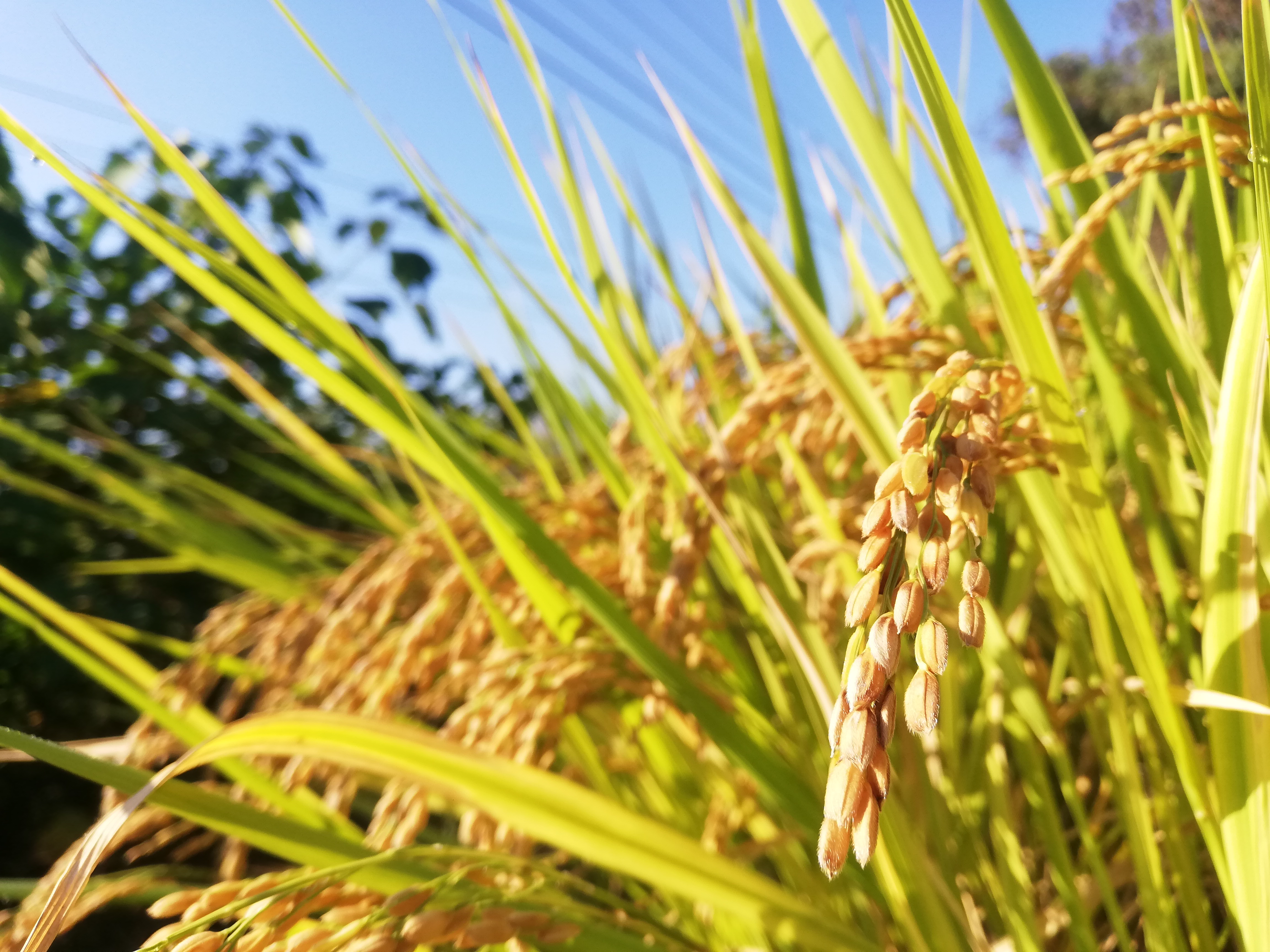 太陽の光に照らされてキラキラと光る稲穂。実りの秋。