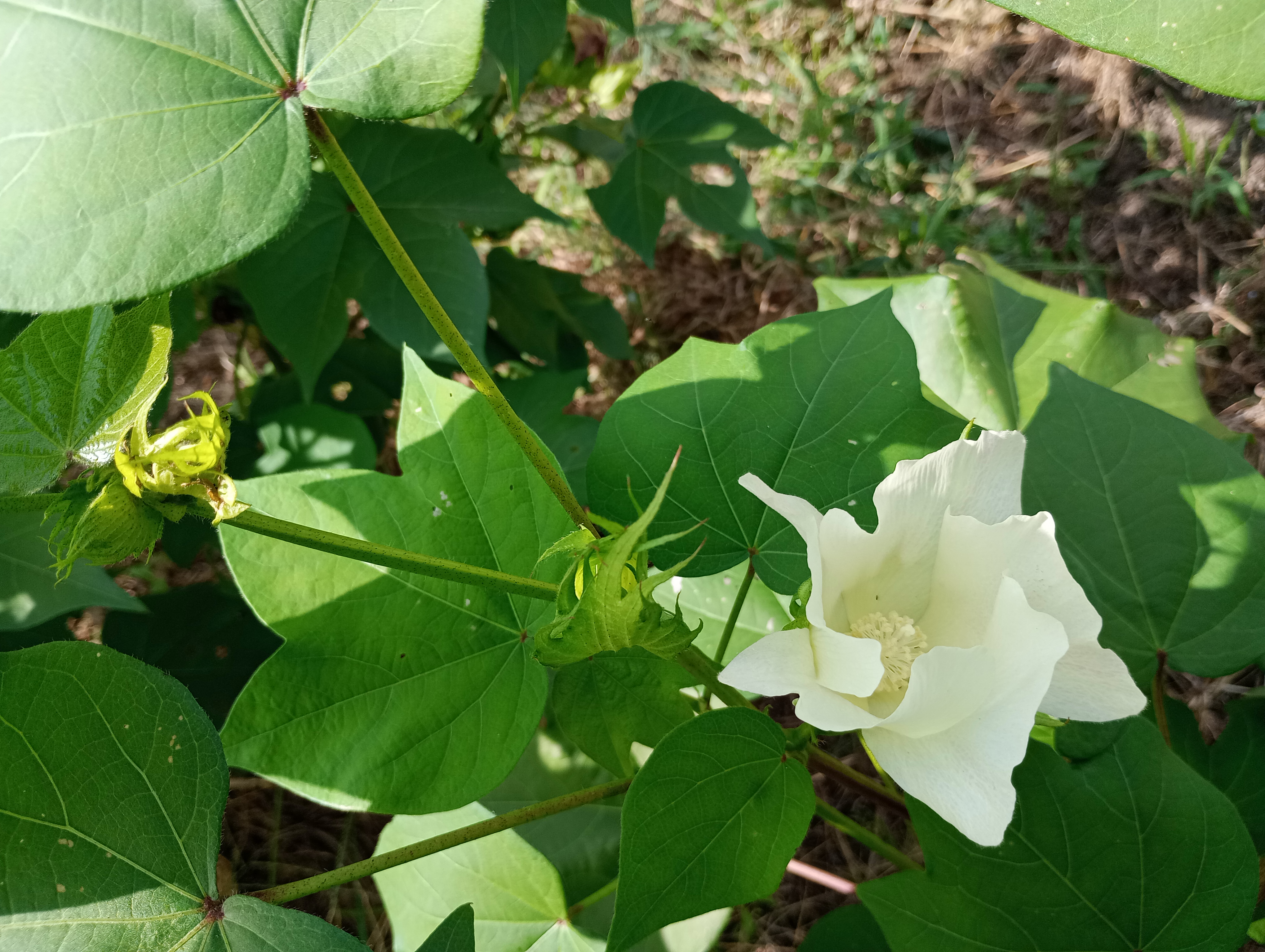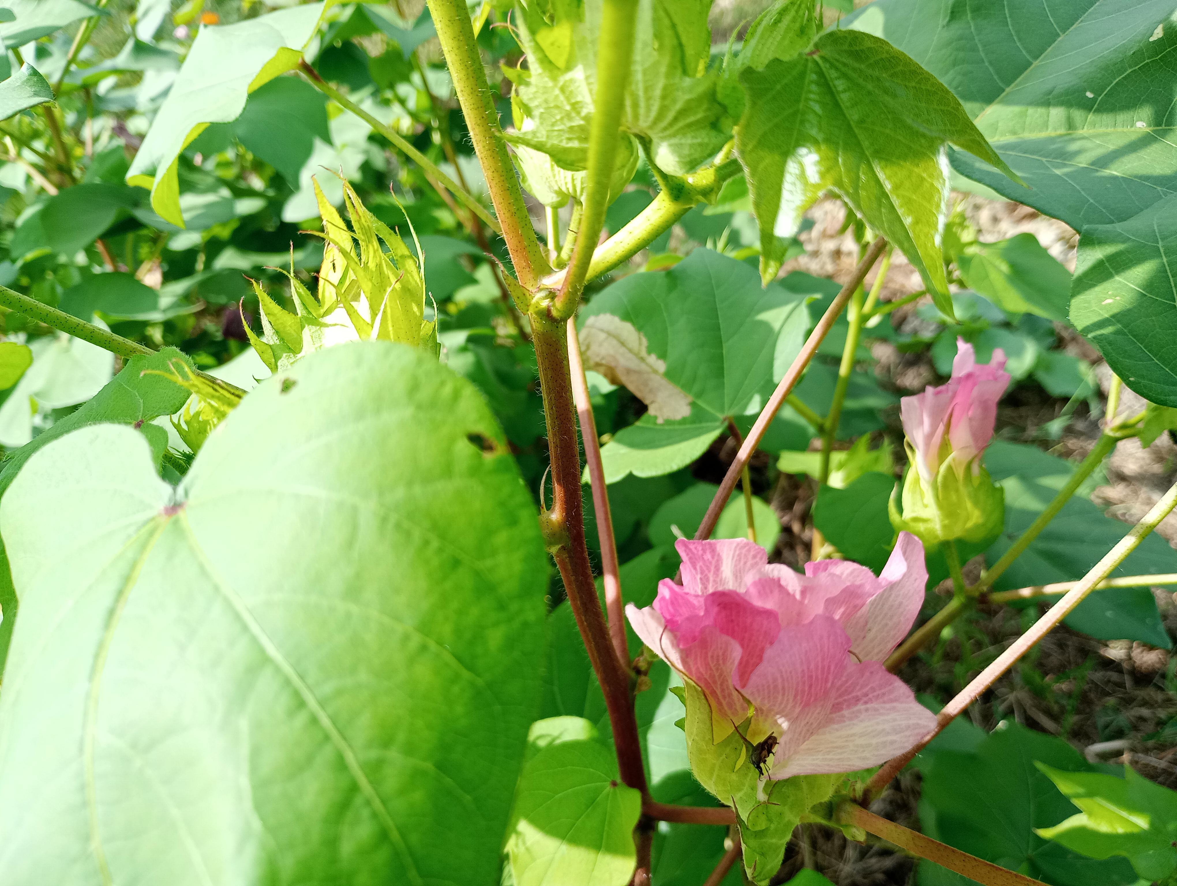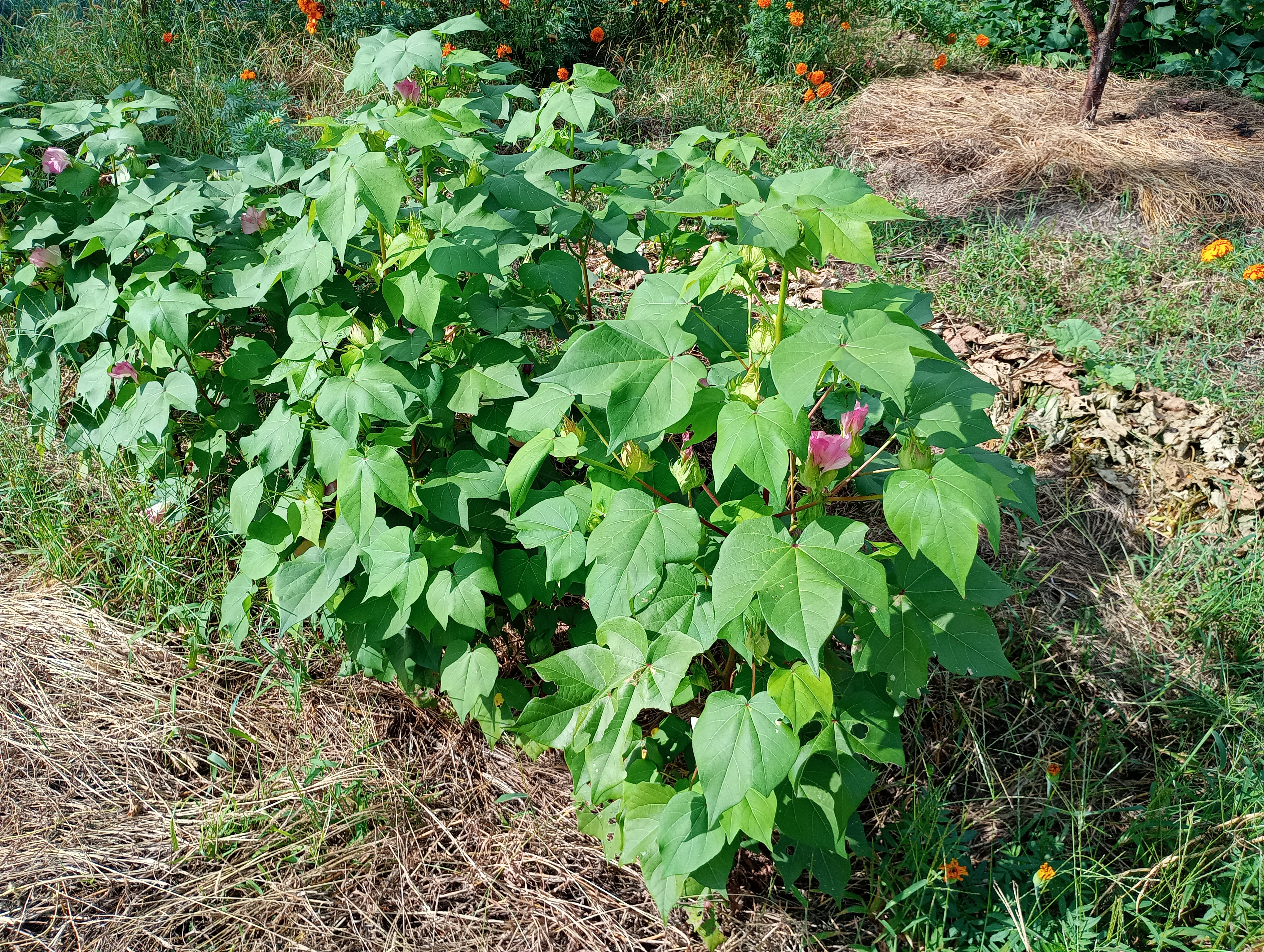 綿の花がきれいに咲いています。春に種まきをして、夏に開花し、今も次々と花が咲いています。白やピンクのこのきれいな花の部分が冬になるともふもふした白い綿になります。